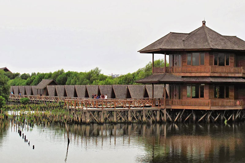 Mangrove Natural Tourism Park is an ecotourism destination located at Pantai Indah Kapuk in North Jakarta. Visitors can explore the mangrove forest and rent a villa there. Cottage villas are available in different sizes and facilities.Complete with facilities such as cafe, restaurants, and playground, staying in mangrove natural Tourism Park is good for family who want their children to understand how to preserve the marine belt by participating in mangrove planting.