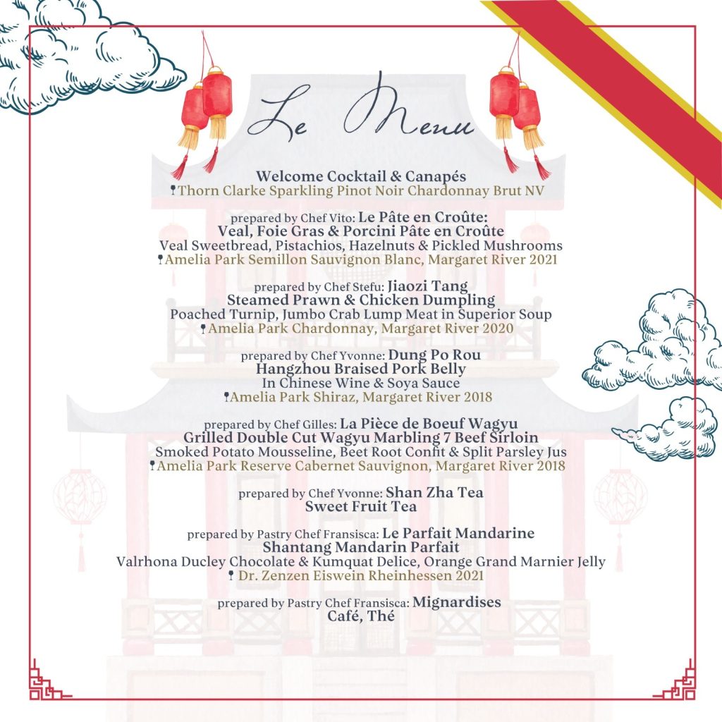 Held at Amuz Gourmet Jakarta, the gala dinner consists of a one-of-a-kind five-course menu paired with premium wines, showcasing the unique pairing of Chinese and French cuisine presented by five chefs. A generous portion of the proceeds will be donated to Yayasan Komunitas Ambiente, a community-in-need in Agats, Papua, in the spirit of the association’s charitable commitments.