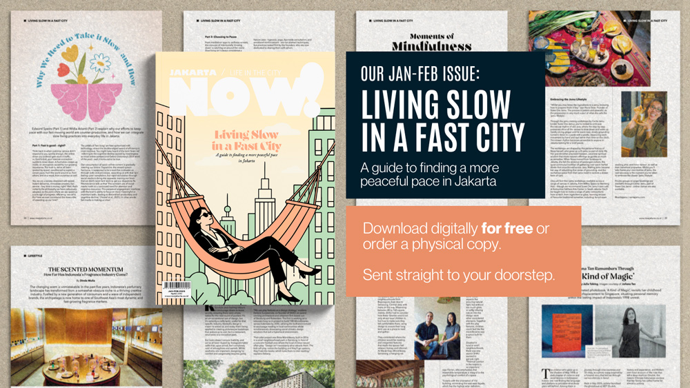 Read the latest edition of NOW! Jakarta Magazine. A digital, downloadable version is available for free, allowing you to read on any device, at any time. Or you can purchase the latest print edition of NOW! Jakarta, available for delivery.