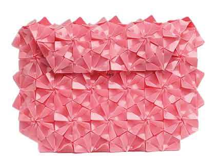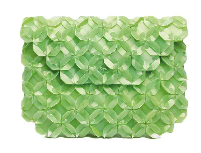 In other words, each clutch is made out of hundred pieces of modules (created of Polyvinyl Chloride/ PVC and latex). Those modules are neither sewn nor glued, as the clutches are actually made by interweaving the modules tightly. Those modules, which are cut by machine, are meticulously hand-woven by Byo’s artisans.
