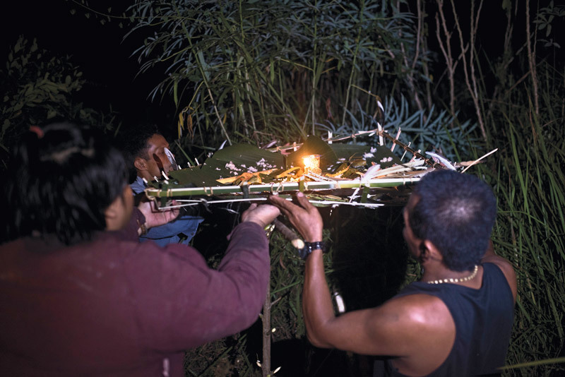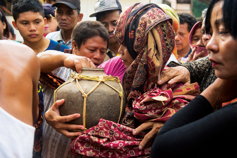 The ninth and final day is the busiest. It begins with the wadians’ chanting, then the idaran is dismantled and the wood used as a platform on which the ashes will be raked after burning. Various other rituals are performed until the bones are ready for burning. After burning, the ashes are retrieved by the families of the deceased and placed in the tambaks. Then a chicken is released as a symbolic gesture of the soul’s journey to freedom.