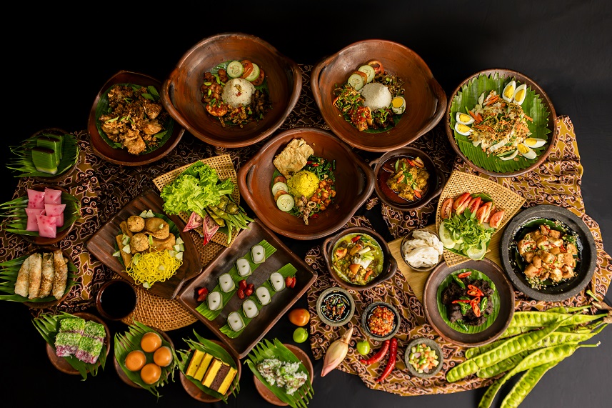 A delectable buffet features a whole range of delicacies, including but not limited to Balinese-style slow-roasted bebek betutu, lamb shoulder: kambing guling with sambal kecap, and nasi campur with nasi putih, kuning, uduk and liwet. Other dishes are also presented, like Sambel Goreng Kentang, Tempe Oreg Kering, Urapan, Tumis Kacang Panjang, Telor Balado, Telor Pindang, Ayam Suwir, Cumi Asin Pedas, Daging Suwir, Ikan Asin Kapas, Teri Kacang, Sambel Goreng Ati Empela, Udang Balado, Ikan Asin Jambal Tumis, Telor Suwir, Rebon Pedas, Tempe Tahu Bacem, Tempe Tahu Goreng, Tempe Mendoan, Serundeng Kelapa. For authentic dessert, the cafe offers Kue Rangi and many more.