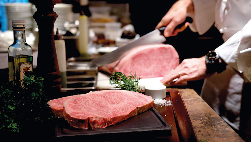 Miyazaki Beef is 100% purebred Japanese Wagyu from the Miyachiku co-op, from the Kuroge Washu breed of cattle, also known as Japanese Black. It is one of only four Wagyu breeds that exist today. Miyazaki Wagyu is recognized for its cherry red colour, tender texture and great dense meat taste. The snowflake-like fat is evenly distributed and produces a non-greasy flavour.