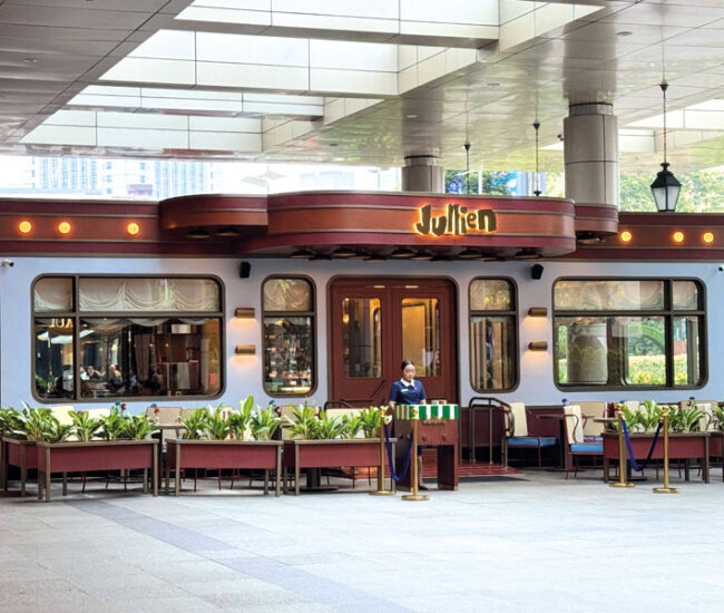 Tucked just behind Galeries Lafayette at Pacific Place Mall, Jullien catches the eye with its distinctive façade. Its brushed bronze canopy curves like the hull of a vintage train, the deep tones and metallic lines recalling a Paris of another era. Step inside and you’re met with the ease of a French bistro, without ever