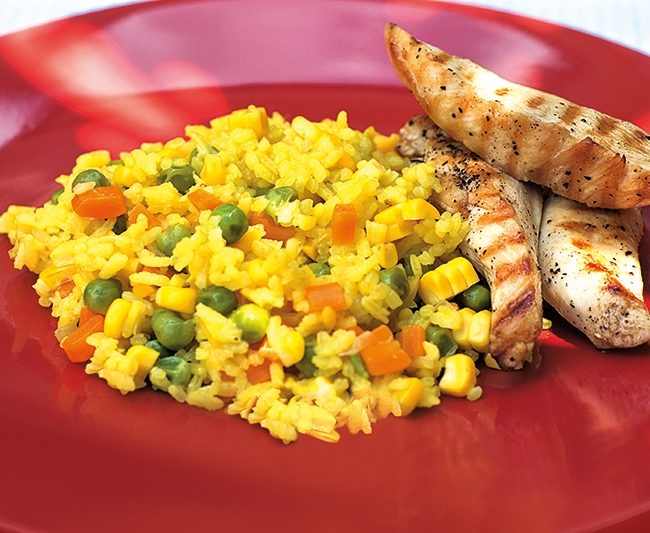 Aromatic Rice with Griddled Chicken Strips. Photo courtesy of Chef Petty Elliott/NOWJAKARTA Aromatic Rice with Griddled Chicken Strips This is a great recipe for introducing spices and new flavours to kids. Living in Jakarta provides an opportunity to learn about different fresh root spices. These are available in all supermarkets. This recipe is very easy