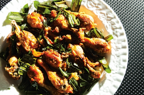Twice-cooked chicken drumstick with pandan and curry leaves. This is one the best version of fried chicken ever. I personally try to avoid fried food but it is hard to resist a piece of golden, deep-fried chicken drumstick. It is important to simmer the chicken on low heat to let all the spices infuse.