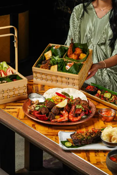 For group occasions, Ramadan Nusantara transforms Jimbaran Lounge into an open-air feast inspired by Indonesian street food culture. Featuring live cooking stations, charcoal-grilled favorites, martabak telor, and traditional sweet treats, the experience is priced at IDR 438,000++ per adult with a 50% discount for children aged 7–12, available for corporate or group bookings with a minimum of 30 persons.
