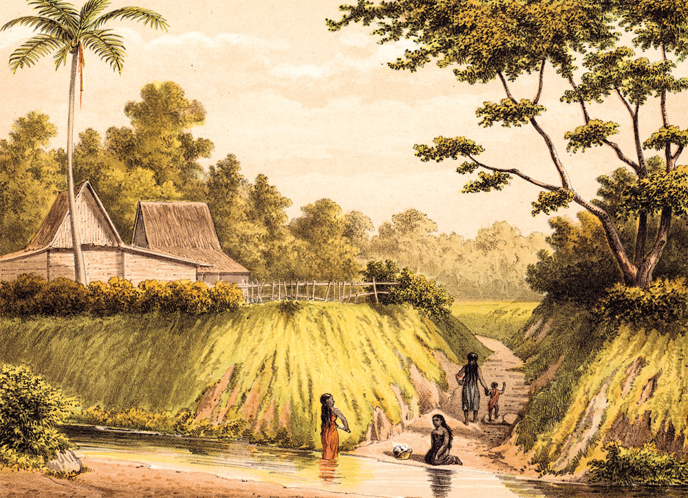 Washerwomen by a river at a Kampong around Buitenzorg, nowadays Bogor. The ladies are carrying baskets of clothes to the banks of a river to wash them, while up the path, a woman carries laundry and walks with a child. This print, published in the year 1883, was made after a painting by Cornelis Rappard, a colonel in the KNIL and a painter. During his posting in the Netherlands Indies 1842-1872, he painted and drew pictures of life and scenes in the Indies that were later, back in the Netherlands, made into chromolithographs. (Sake Santema Collection)