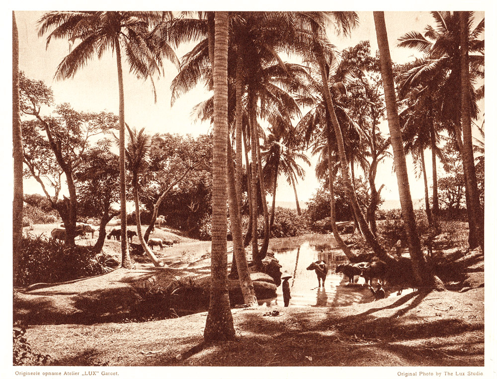This photo from North Bali, circa 1920, captures a tranquil rural scene: people and water buffaloes bathing together at dusk, surrounded by lush palm trees in a timeless landscape. A photograph by Thilly Wiesenborn, the first female professional photographer to visit Bali around the year 1920. Thilly Weissenborn owned her own studio in Garut, West Java. Her works were widely used to expand the newly developed tourism industry of the East Indies. (Sake Santema Collection)