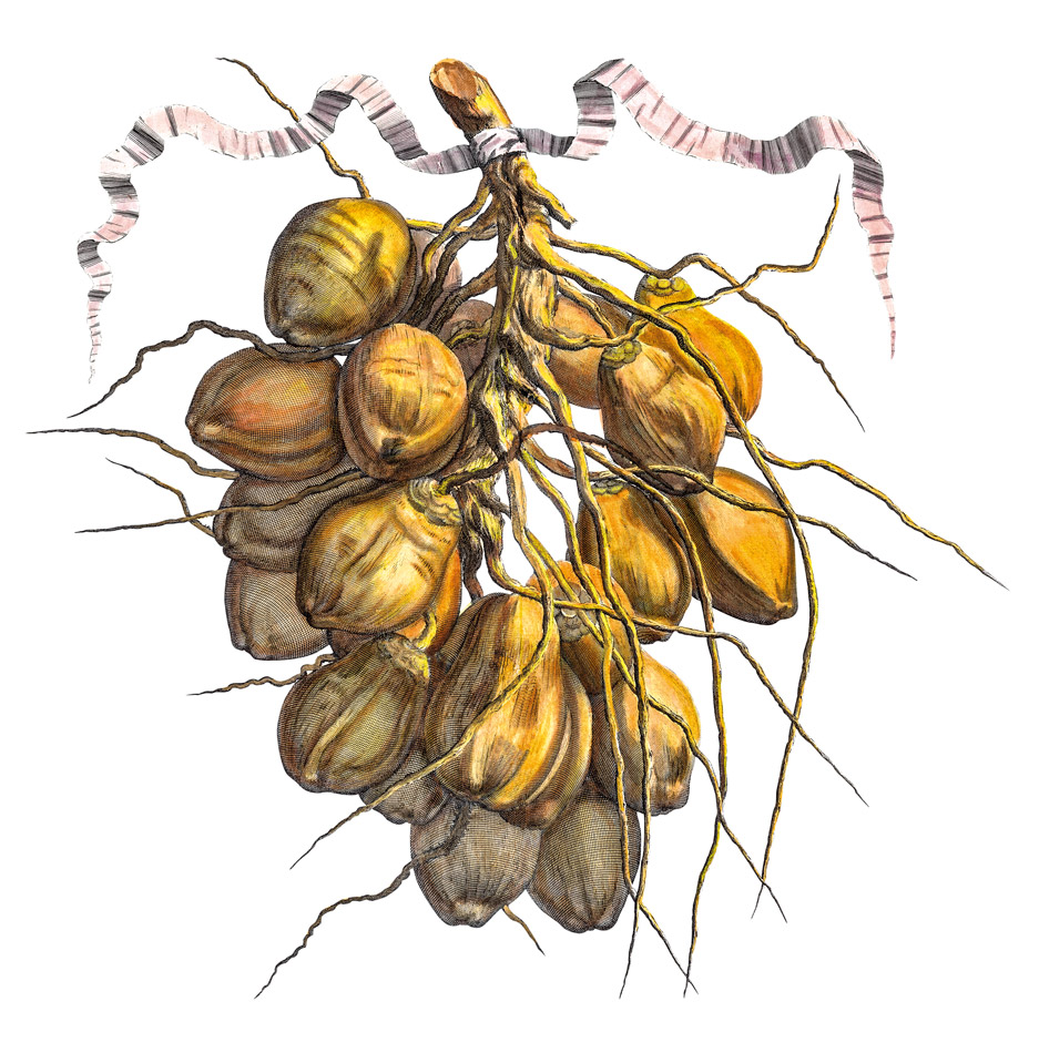 Image above: An early print of a coconut tree, labelled in Latin, Malayalam, Arabic, and Sanskrit. Published in the year 1678 in the Netherlands, in a comprehensive record of the plant’s many uses. (Sake Santema Collection)