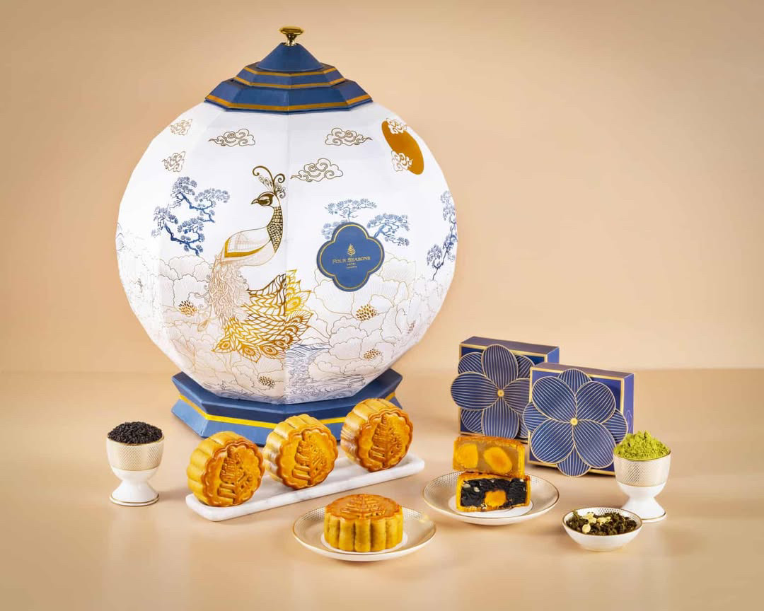The sweets are housed in signature Four Seasons gift boxes — an elegant lantern for Classic Mooncakes and a sculptural hamper for Fortune Cakes. These include the Mooncake Lantern: IDR 1,488,000, Fortune Cakes Hamper: IDR 728,000, and the Mid-Autumn Gift Box: IDR 688,000, available for orders of 20 boxes or more.