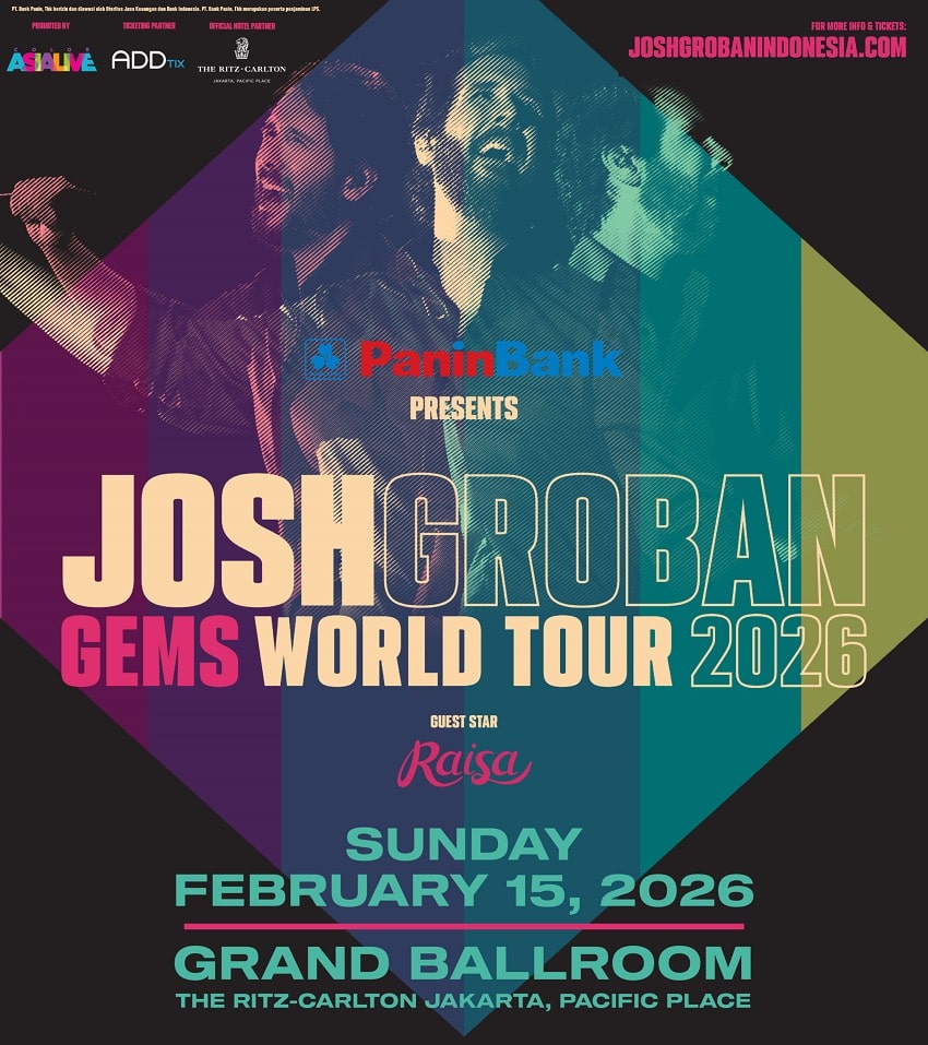 Josh Groban brings his Gems World Tour to a ballroom setting that suits his classical crossover and contemporary ballad repertoire. Indonesian singer Raisa is expected to appear as a guest, adding a local dimension to the evening.