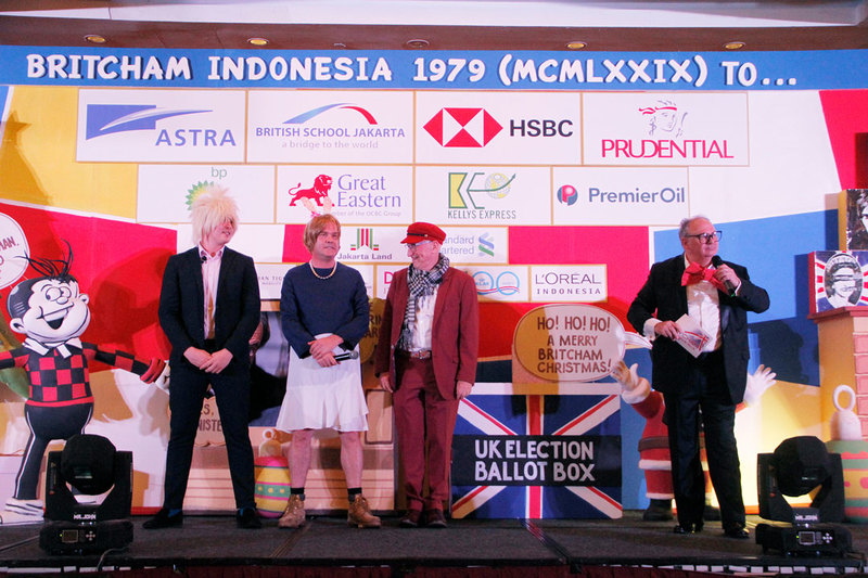 The night was opened by a speech from H.M.A Owen Jenkins, British Ambassador to Indonesia and Timor Leste, followed by a lovely Christmas carol performed by four talented students from the British School Jakarta. Following last year’s success with BritCham’s Got Talent competition, this year BritCham’s Chairman, Ainsley Mann was back on the stage performed a parody of the current UK election as Nicola Sturgeon – Scotland’s First Minister along with Mike Woolf playing as Jeremy Corbyn.