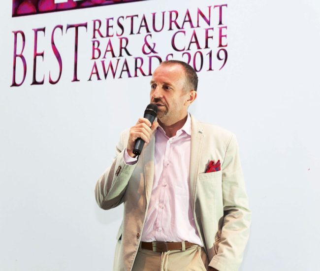 Chef Gilles Marx received Chef of the Year from the annual NOW! Jakarta Best Restaurant, Bar and Cafe Awards (BRBCA) 2019. Photo by Raditya Fadhilla/NOWJAKARTA The French Chef holds a trophy from Best Restaurant, Bar and Cafe Awards (BRBCA) 2019. The creative mind behind French fine-dining restaurant AMUZ, Chef Gilles Marx has received an honorary achievement as