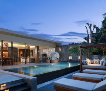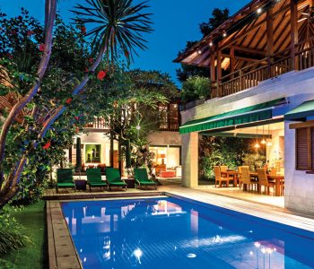Villa Shinta Dewi in Seminyak rests within the exclusive and secure Laksmana Estate, just 500 metres from Petitenget Beach and within walking distance of Seminyak’s famous restaurants, shops, beach clubs, nightclubs, bars and spas. Pool at dusk. Photo Courtesy of Villa Shinta Dewi Seminyak The villa is filled with sophisticated, comfortable furnishings, and comprises five