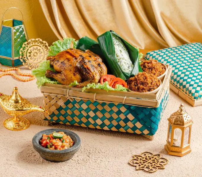 Beyond dine-in, Djaman Doeloe offers a takeaway Bingkisan Ramadan hamper at IDR 288,000++, featuring Ayam Bakakak, Nasi Daun Jeruk, Sambal Dadak, and Bebek Goreng Remuk.