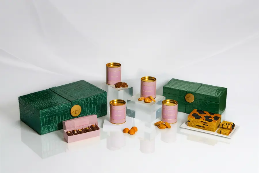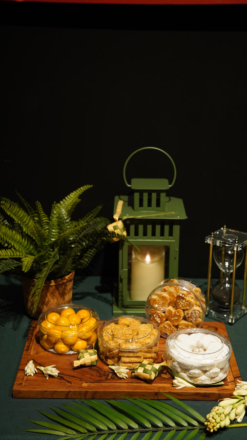 Ramadan gifting is expressed through curated hampers. The Signature Raya Hamper, priced at IDR 1,988,000++, includes Pineapple Tart, Kaastengel, Langue du Chat, Sago Cheese, a Pandan Beeswax Candle, Dates Honey, a scarf by KAMI, and Harumi Matcha Powder by Uji Matcha. The Divine Blessings Hamper, at IDR 988,000++, offers a refined selection of festive cookies.