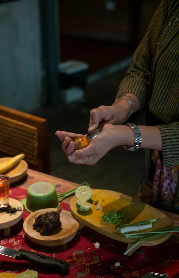 There are many different kinds of jamu, but typically the most common include kunyit asam, beras kencur and wedang jahe. Nova guides participants to create these but importantly helps to explain the flavour elements and their general effect on the body. “Bitter flavours are for healing, spices are for activation, the sour like from tamarind are more for digestive detoxes,” she explains. “These are not your regular cooking ingredients, for jamu, we must find the more mature roots and rhizomes,” she says, holding out bulbous turmeric and gingers, spritzing their aromas into the air upon being snapped open.