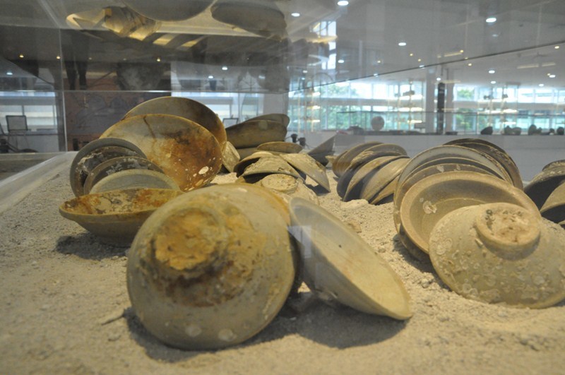 But inside one is surprised to see such bright and well arranged displays. The exhibits come from the cargo of three ancient ships that perished in Indonesian waters: the 9th-century Belitung or Batu Hitam wreck, the 10th-century Cirebon wreck and the 13th-century Pulau Buaya wreck. On display are mainly Chinese ceramics from the Tang and Song periods, but also Southeast Asian earthenware, metal objects, bronze statuettes, some Near Eastern glass bottles, beads, coins, and so on. The bilingual labels are clear, though sometimes a bit short, but there are also leaflets and audiovisual material available for further explanation. On the same floor a library is being set up for visitors who want to delve deeper. However, don’t expect to see here those bright, shining blue and white or polychrome porcelain pieces as in other museums! All objects displayed have rested for centuries on the bottom of the sea and this has left its mark: most items look grey and dirty and most of the original glazes have gone.