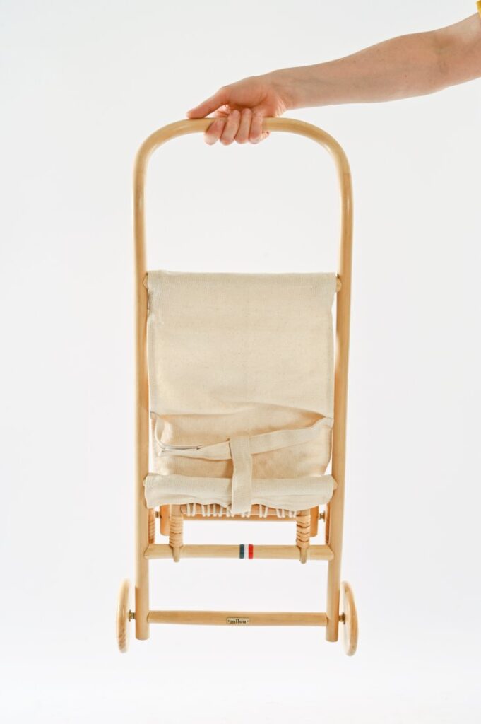The stroller strikes a perfect balance between charm and functionality. A curved rattan handle and a low, stable frame on wooden wheels suggest a piece designed for easy, everyday handling. Every surface reflects the care and attention given to the finishing, from its rounded joints and evenly sanded rattan to fabric that sits taut against the frame. The stroller folds down light and compact, with practical details such as washable fabric, a macramé storage net, and gentle colour accents that place it closer to functional furniture than a child’s toy. This level of consideration explains why the stroller has become Milou’s most purchased piece to date.