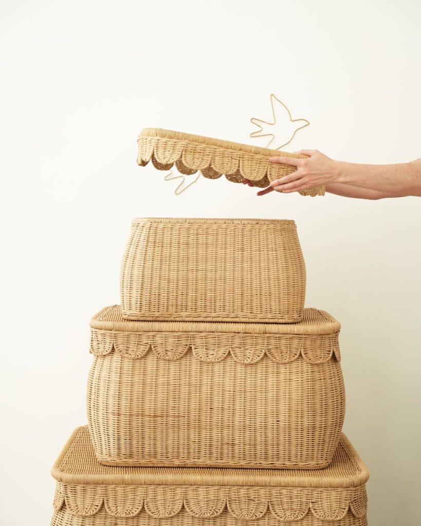 Decorative yet practical rattan storage with scalloped detailing. Available in three stackable sizes for toys, blankets, or shared spaces; designed to move easily as family needs change.