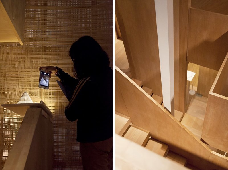Lim Masulin who collaborates with Matin has worked on the facade of the installation with intricate rattan weaving which was inspired by pattern of Indonesian textiles. The visitor is welcomed to discover nine different traditional Indonesian houses, including Rumah Joglo from Java and Honai from Papua through a spiral staircase made of Jabon wood where the scale model of houses are placed in order of the real life elevation.