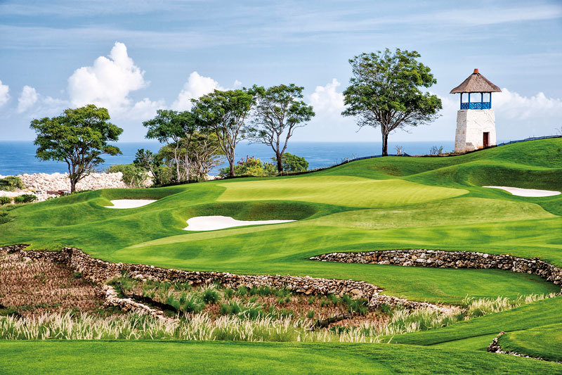 While Bukit Pandawa Golf & Country Club will get any golfer’s attention straight away – panoramic views of the Indian Ocean from the opening tee box does the trick – it was designed to up the ante with each passing hole. To with the 148-yard 13th, which is framed by three bunkers and features curved stone walls in the foreground and a traditional Balinese kul-kul tower in the background; and the aforementioned home hole.
