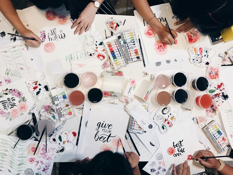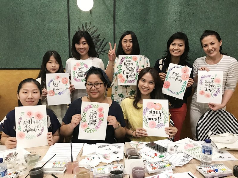 My class is relatively small, with ten to fifteen participants, and the venue varies from a real classroom to a long table at a coffee shop. The vibe of the class is casual and relaxed, yet still informative and educative. The duration of the class is four hours in which the participants will learn the basic strokes of calligraphy, shapes and anatomy of twenty six alphabet letters, basic watercolor skill and loose floral painting. By the end of the class, all participants will be able to combine the calligraphy art with the floral painting, creating a beautiful final artwork.