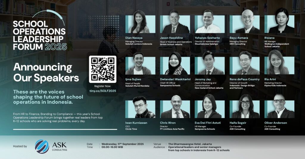 School Operations Leadership Forum 2025 (SOLF 2025), set to be hosted by ASK Consulting on Wednesday, 17 September 2025 at The Dharmawangsa Jakarta, is Indonesia’s only dedicated gathering for the high-quality professionals who ensure schools run smoothly and sustainably behind the scenes.