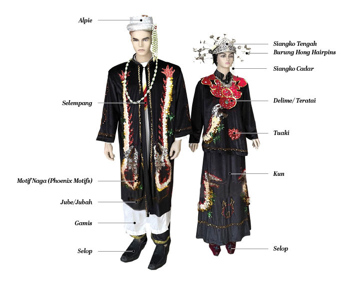 For footwear, both groom and bride wear selop perahu kolek or selop kasut (loafer-style shoes) like Dutch clogs.