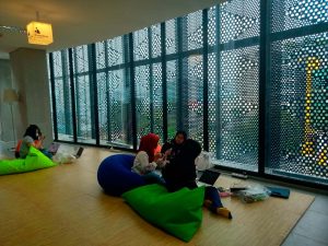 A number of facilities or spaces also can be used by visitors, such as multifunctional room, story room, and private reading room, special space for visitors who need a separate place to read or finish their work. Then, there is also a podcast room, broadcast room, discussion rooms, and computer room. This library is also friendly to people with special needs by providing access and a special room for them to read or do other activities. Not only providing books in Braille, but also computers and audio-visual equipment are also provided.