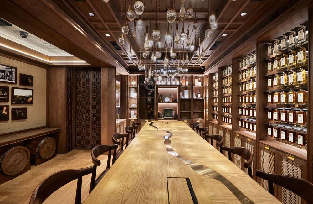 The venue includes a retail storefront featuring the core range of the distillery, for those simply looking to purchase their favourite bottles. Further inside, a handsome ‘tasting room’ awaits, a cosying space where visitors can immerse themselves in smells and flavours of the ‘amber liquid’, showcasing treasured whiskies from the family archive for guests to experience. Lining an entire wall are bottled distillery samples, recreating the experience one might have directly at distilleries, with cask tastings led by Brand Ambassadors.