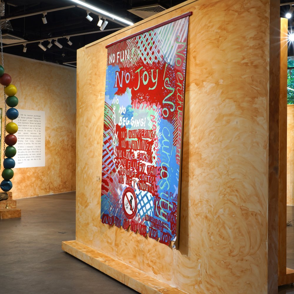The funniest painting here is also the one that comes closest to a kind of rage. No Fun No Joy (2025) begins with a “no dogs” sign, something that’s common in Indonesia, but rare Germany, where dogs are generally allowed into shops. She deliberately misreads it, and the misreading expands into a relentless litany: “NO LONG EARS! NO FLUFFY TAILS! … NO FRIENDSHIPS! NO COMPANIONSHIPS! NO UNCONDITIONAL LOVE!” The surface is loud with warning-red, the typography crammed and forced into awkward breaks, and the repeated “NO! NO! NO!” starts to sound less like signage and more like a person trying to talk themselves out of needing anything. Lawrence points out the places where the wording doesn’t fit, where a line buckles. Those buckles matter. They are the point at which the painting admits it is made by someone with limits.