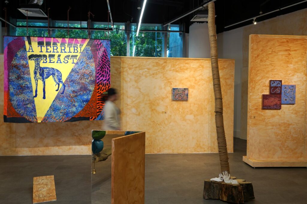 The paintings displayed at the HOARSE HORSE exhibition by Berlin-based artist Ida Lawrence do not behave like paintings. They hang, slack-backed and unstretched, as if they have shrugged off the polite posture of the gallery wall. Some are tethered with straps and rope; others carry hardware in the form of collars, leashes, and fastenings. The show is staged at ISA Art Gallery in Wisma 46, but the mood is homey and intimate. It feels closer to walking into a studio where the work is still deciding what it is, and you have arrived right into the journey.