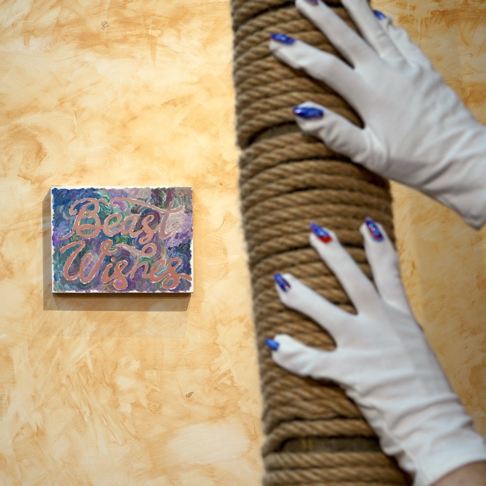 Projection becomes literal in A Terrible Beast (2021–2025), a large unstretched work held together with handstitching, straps, rope, and metal parts (similar to a dog’s leash). It announces itself like a warning sign, then undercuts its own authority with the phrase “TO PROJECT ONTO.” The humour is not that the dog appears harmless, but that the audience arrives ready to make it mean something. Ida speaks of mascots, national animals, and the way fables train us to read creatures as shorthand for human traits: sly fox, loyal dog, noble eagle. Yet these animals, she reminds us, are simply living their lives. The qualities we attribute to them are not theirs, but ours. We recognise ourselves in them, then pretend the reflection belongs to the animal. Which raises the question, if we identify with these projected beasts, what does that say about the way we understand ourselves?