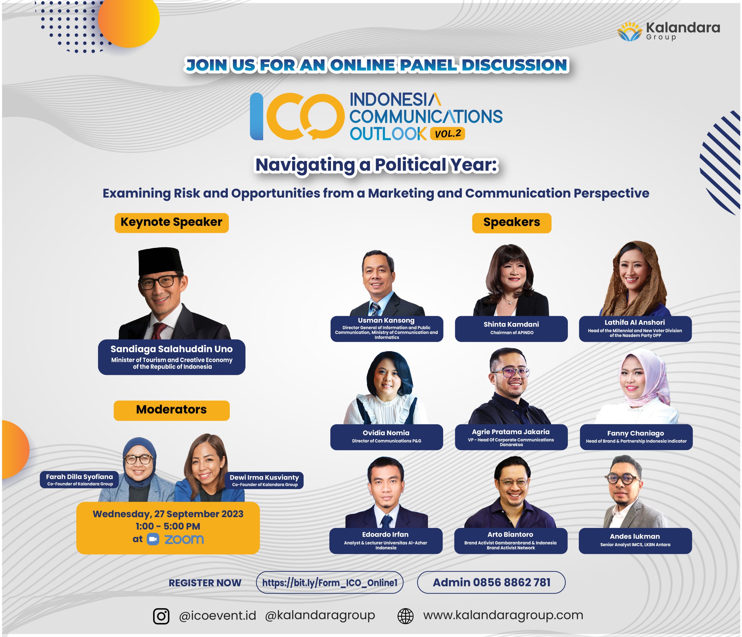 This event brings together inspiring speakers, networking opportunities, and informative panel discussions. The theme of Indonesia Communications Outlook 2023 Vol.2 is “Navigating a Political Year: Examining Risks and Opportunities from a Marketing and Communication Perspective.” Speakers and participants will engage in discussions about strategies and challenges related to significant political events in the coming year and how to leverage opportunities from marketing and communication perspectives.