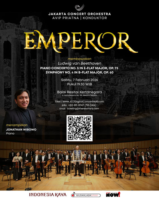 Jakarta Concert Orchestra will stage Emperor, a concert celebrating two works by Ludwig van Beethoven, at Balai Resital Kertanegara on Saturday, 7 February 2026, starting at 7.30 pm. Led by conductorAvip Priatna, the programme features Piano Concerto No. 5 in E-flat Major with Jonathan Wibowo as soloist, paired with Symphony No. 4 in B-flat Major.