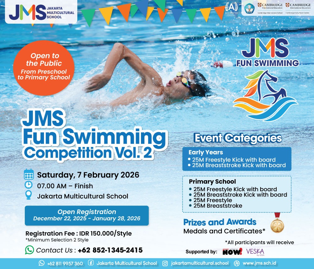 Jakarta Multicultural School’s Fun Swimming Vol. 2 is carefully designed to provide a positive introduction to competitive swimming. This well-structured event allows young swimmers to build confidence, demonstrate fundamental skills, and develop a genuine love for sport – all within a fun and nurturing atmosphere.