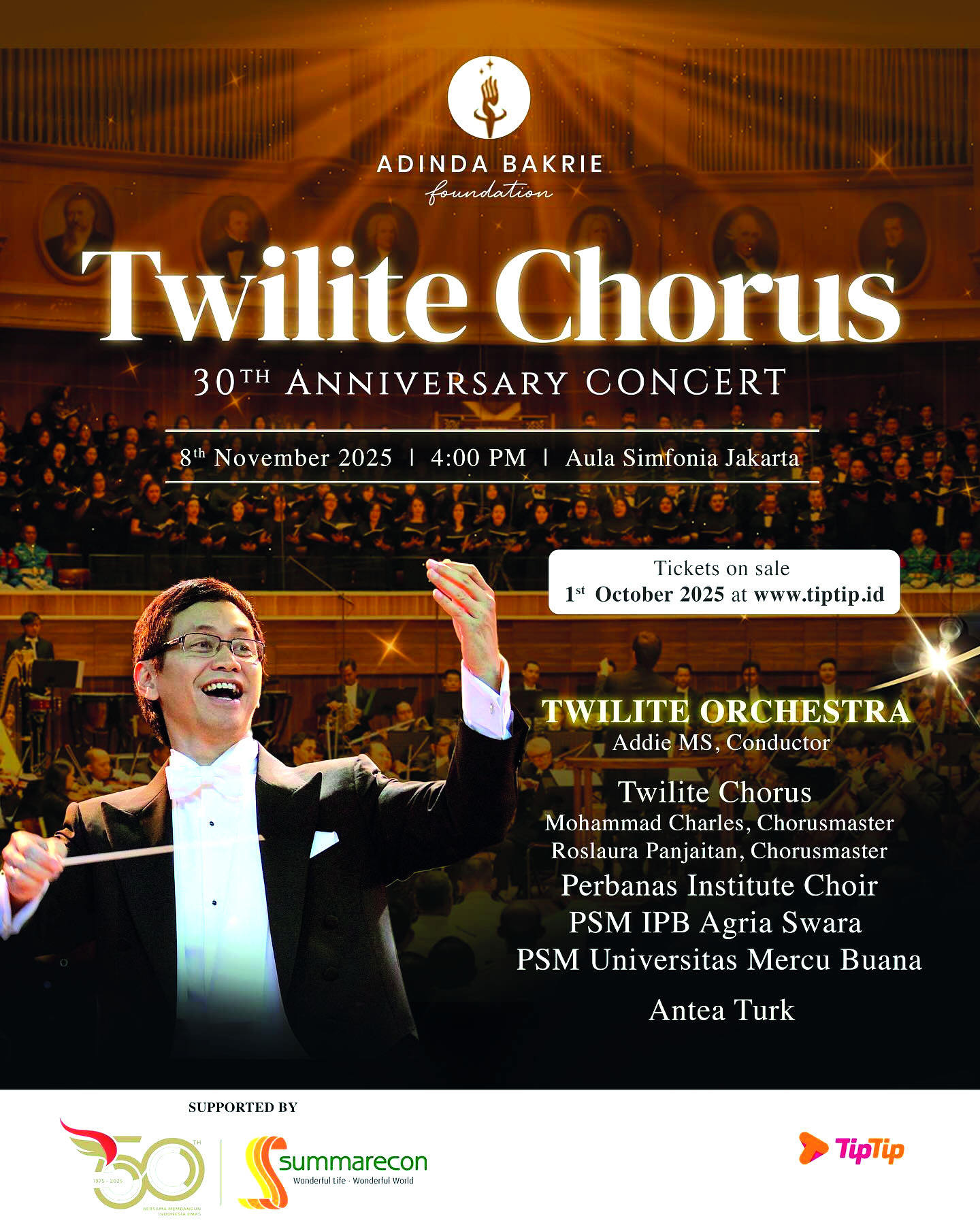 Marking three decades of a remarkable musical journey, the Twilite Chorus celebrates its 30th anniversary with a grand concert at Aula Simfonia Jakarta. The evening will feature powerful choral renditions of Indonesian national and folk songs, popular film soundtracks, and timeless classical works. Joined by the Twilite Orchestra, the performance also brings together numerous choir groups, forming an ensemble of 200 voices. Highlights include “Bangun Pemudi Pemuda,” “Janger,” “Somewhere in My Memory,” and “Triumphal March.” Tickets are available via tiptip.id or through +6281119111888.