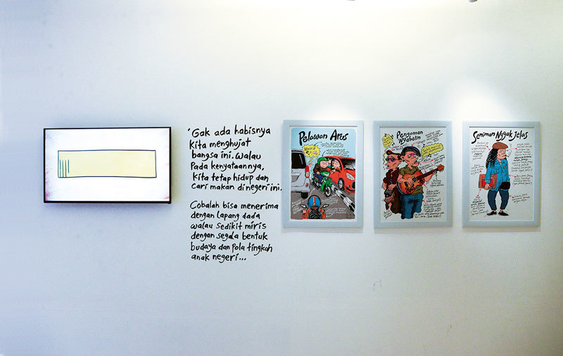 Cartoonist Muhammad “Mice” Misrad presents a humorous series of drawings that plays with the stereotypes of what is typically and pure Indonesian, whereas Alit Ambara uses the common shape of a heart in his digital art to redefine its original meaning.
