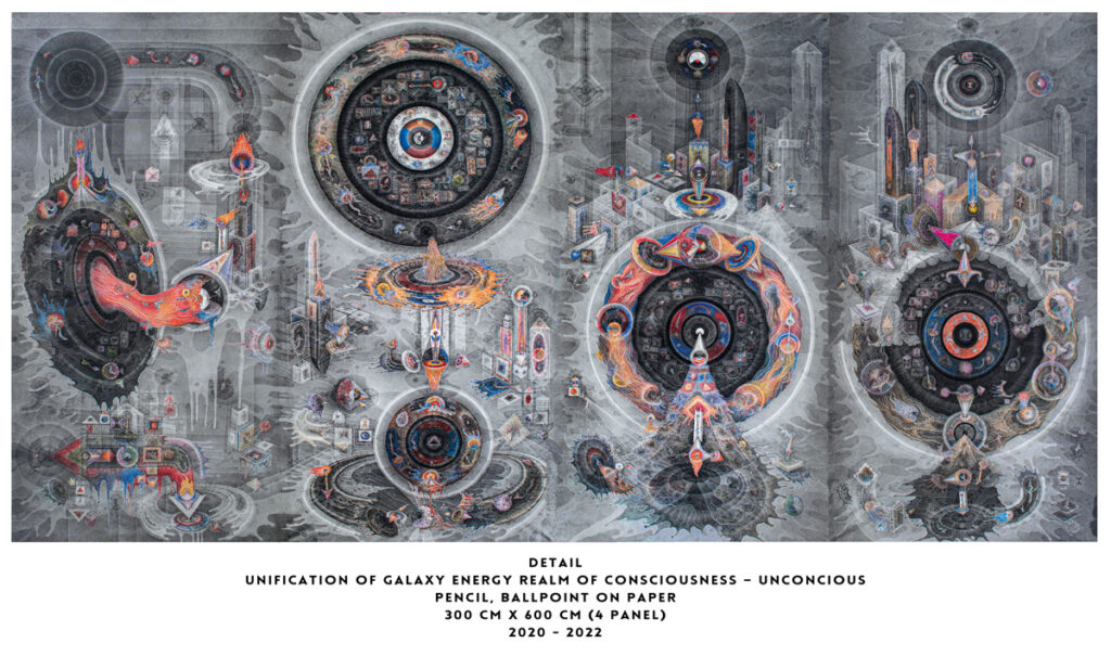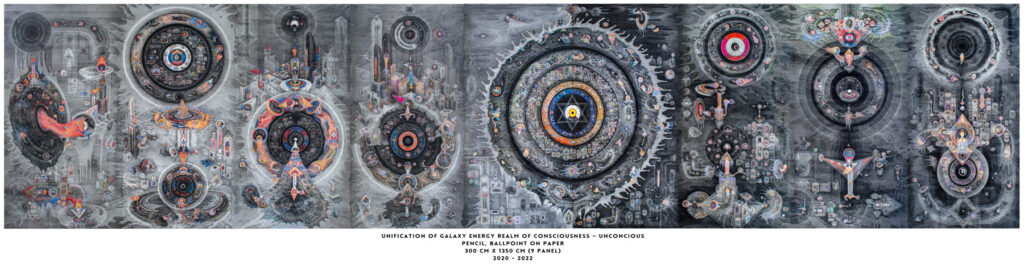 When gazing upon Wirantawan’s work, one is immediately struck—if not utterly overwhelmed—by elements that feel eerily alien to the familiar languages of contemporary art. These are not mere compositions, but vast symbolic terrains, immense in ambition and metaphysical weight. Within them, regularities—some sharp, others tapering, many ghostly and irregular—collide, fuse, and metamorphose in an unceasing dance. What first presents itself as chaos slowly yields a deeper order, emerging either through labyrinthine intricacies that draw the eye into a microcosmic abyss, or through swelling geometric spirals—each laced with delicate, obsessive detail—that hint at cosmic architectures endlessly expanding and collapsing. These structures are bound to one another like nested universes, each orbiting, spiralling outward, or disappearing into the minutiae of the next.